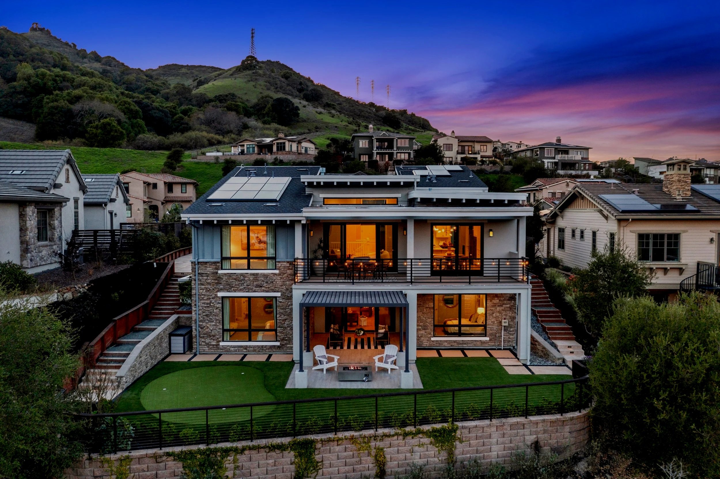 Custom designer chandeliers, new hardwood flooring, curated fixtures, and tailored drapery and window treatments create a refined, cohesive aesthetic throughout. The beautifully landscaped backyard is designed for both relaxation and gatherings, featuring a fire pit, mini golf, tranquil zen garden with water feature, and a charming courtyard with ambient lighting.